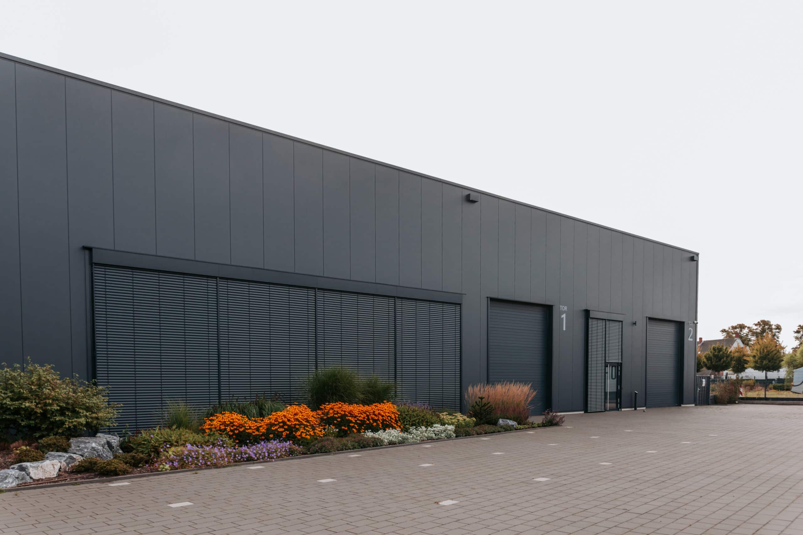 Der zweigeschossige Bürotrakt misst 30 × 10 Meter und bildet mit klaren Linien, vertikalen Fensterbändern und hochwertigen Fassadenpaneelen einen repräsentativen Empfang für Besucher. Direkt angrenzend befindet sich die 47,25 × 16,30 Meter große Ausstellungshalle, die als Showroom und Schulungsbereich genutzt wird. Dank der Hybridbauweise aus Stahltragwerk und tragenden Massivbauteilen vereint das Gebäude hohe Tragfähigkeit mit flexibler Raumnutzung – ideal für große Maschinen, Besuchergruppen und Vorführbereiche.