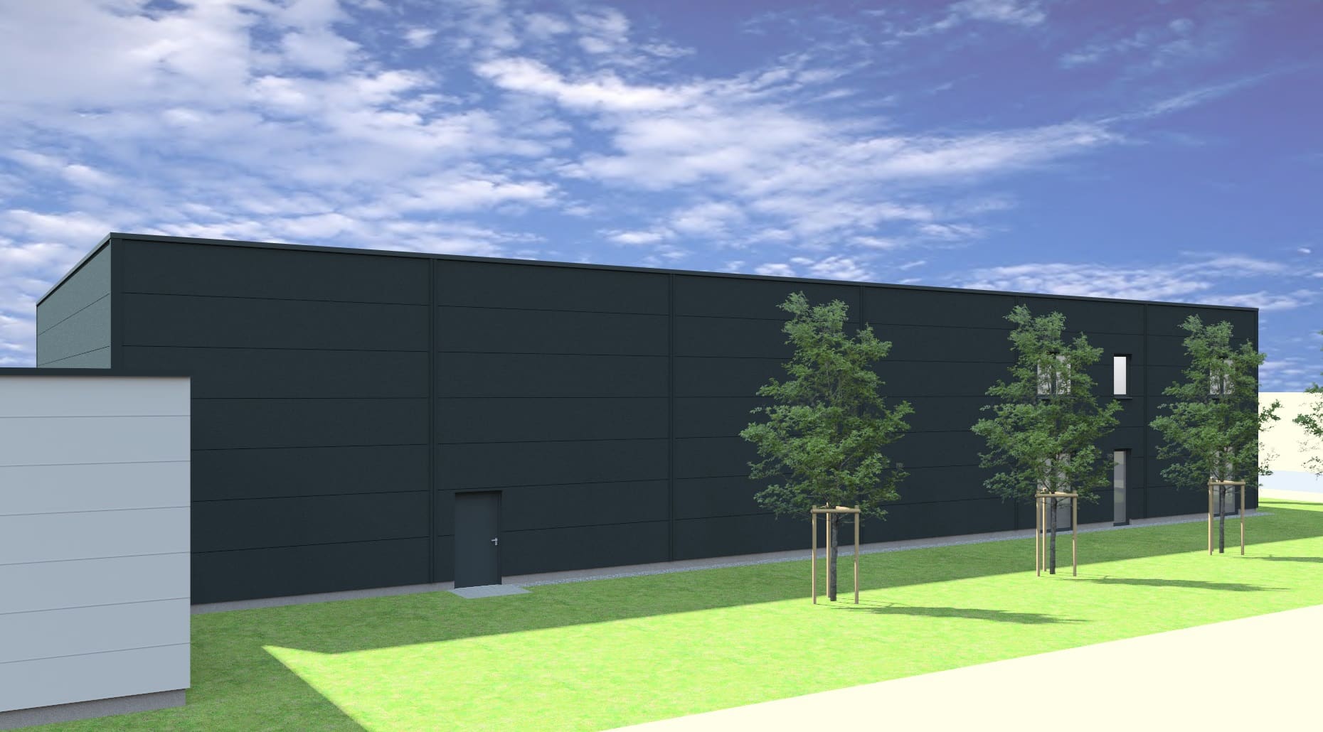 Eine besondere Herausforderung stellt der Durchbruch in die bestehende Porenbetonfassade dar, um den neuen Gebäudeteil harmonisch in den Bestand zu integrieren. Auch die optische Gestaltung setzt Akzente: Die Pfosten-Riegel-Fassade im Sonderfarbton RAL 9005 – Tiefschwarz – verleiht dem Neubau eine markante und hochwertige Anmutung.