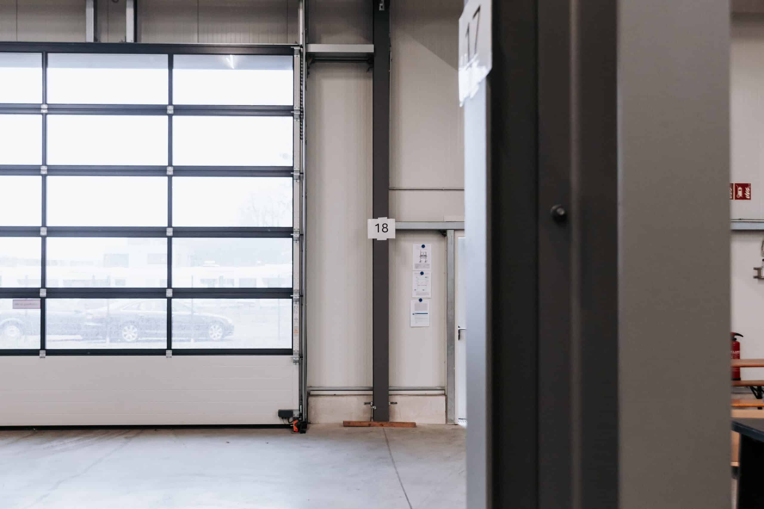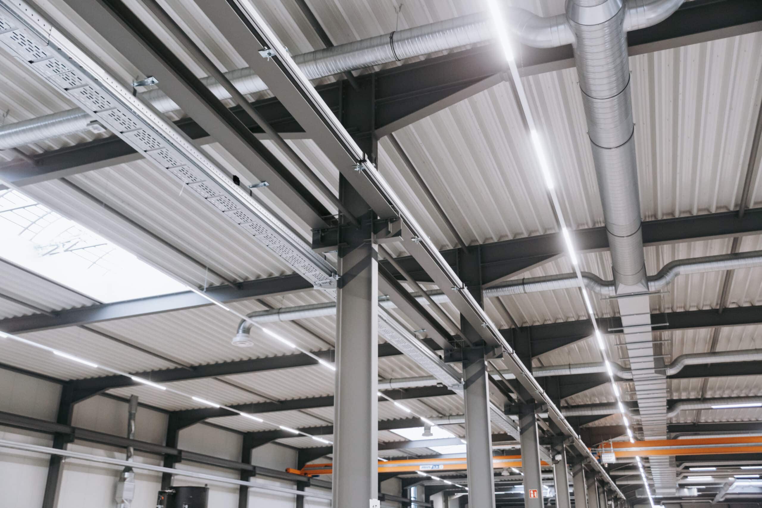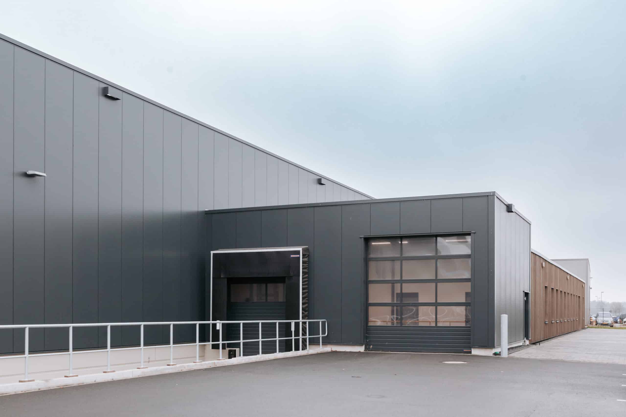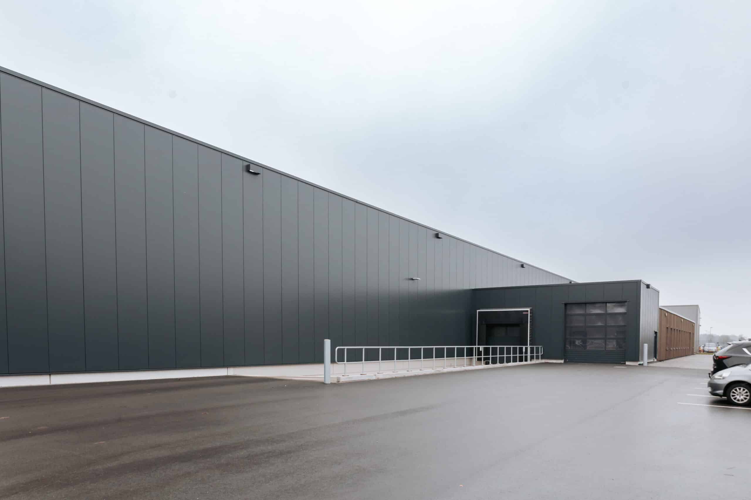 Die Gebäudehülle besteht aus hochwertigen Thermowand-Elementen sowie einer Warmdachkonstruktion mit PVC-Dachabdichtungsbahn. Architektonisch prägende vertikale Fensterlichtbänder in der Fassade sowie ein Dachlichtband sorgen für viel Tageslicht in den Hallenbereichen und verbessern die Aufenthaltsqualität für die Mitarbeitenden. Funktionale Sectionaltore gewährleisten reibungslose Be- und Entladeabläufe im täglichen Betrieb.